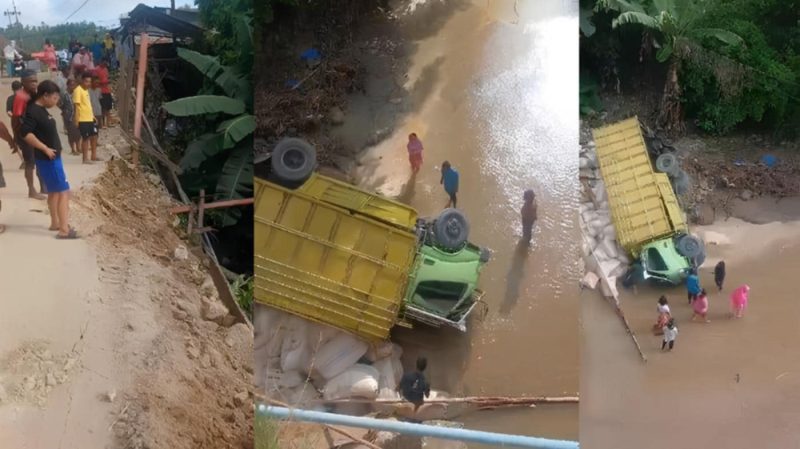 Dalam kondisi jembatan yang sudah rusak dan terjal, truk kehilangan keseimbangan hingga akhirnya terjatuh mundur ke sungai.